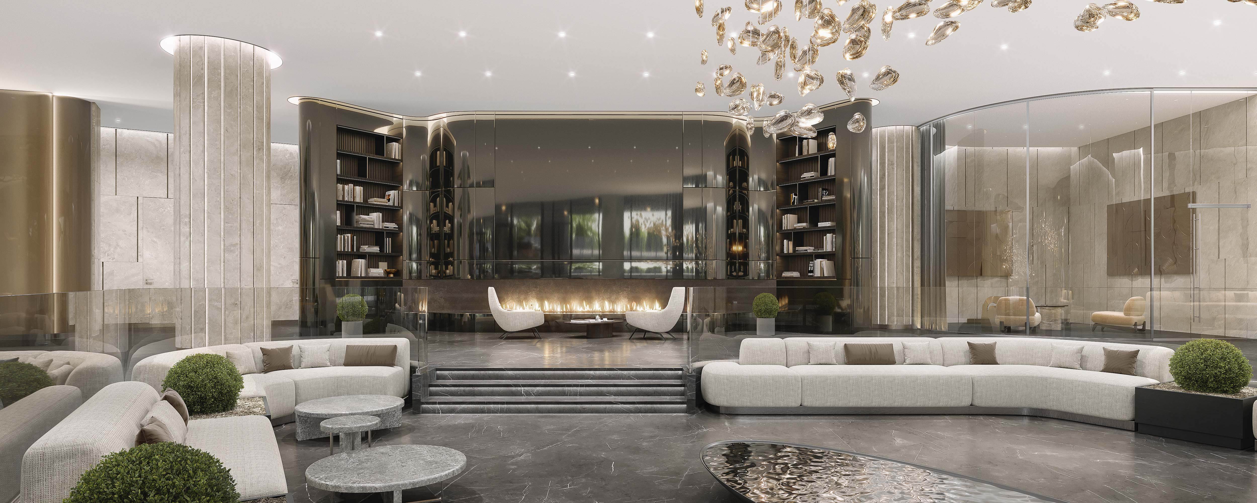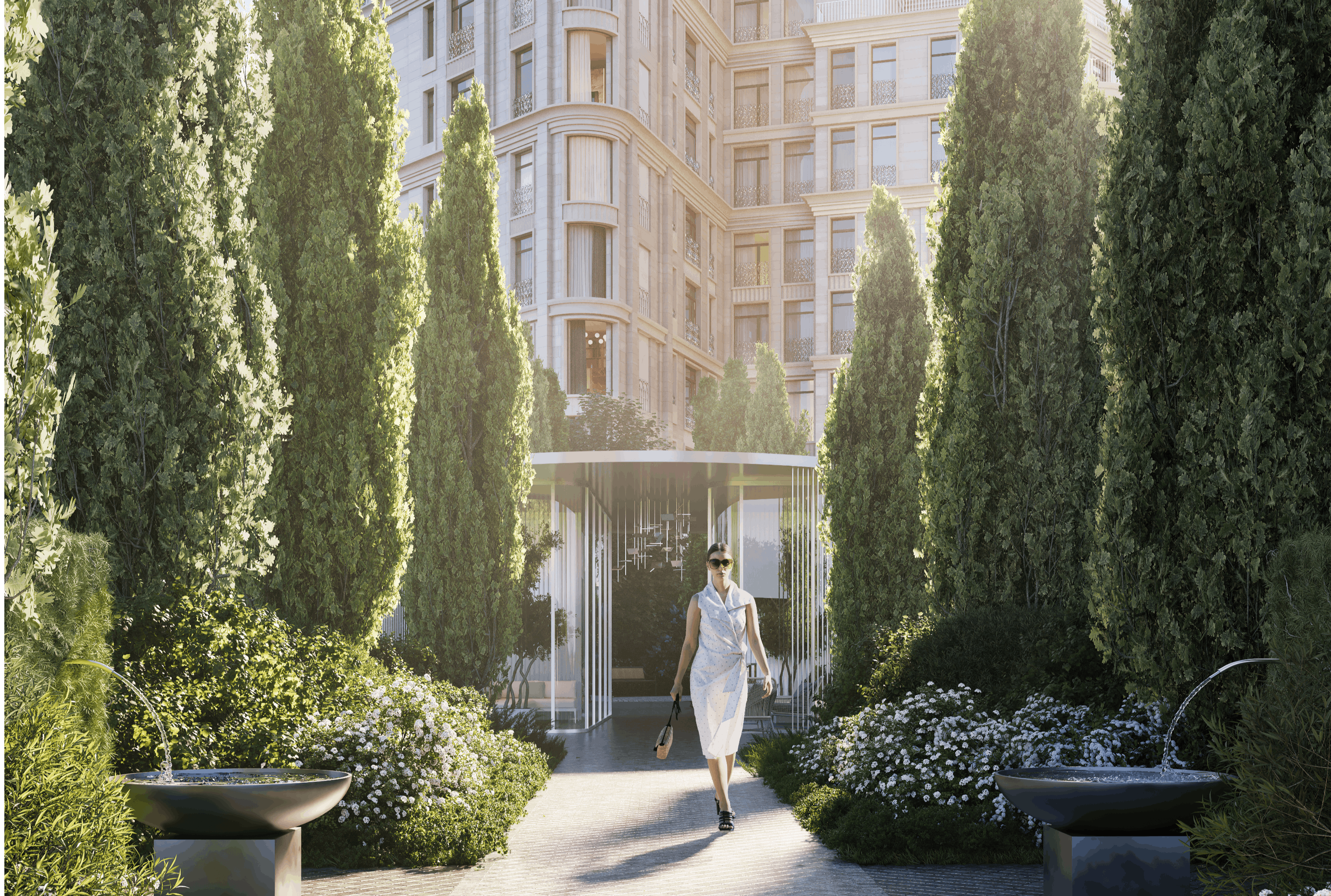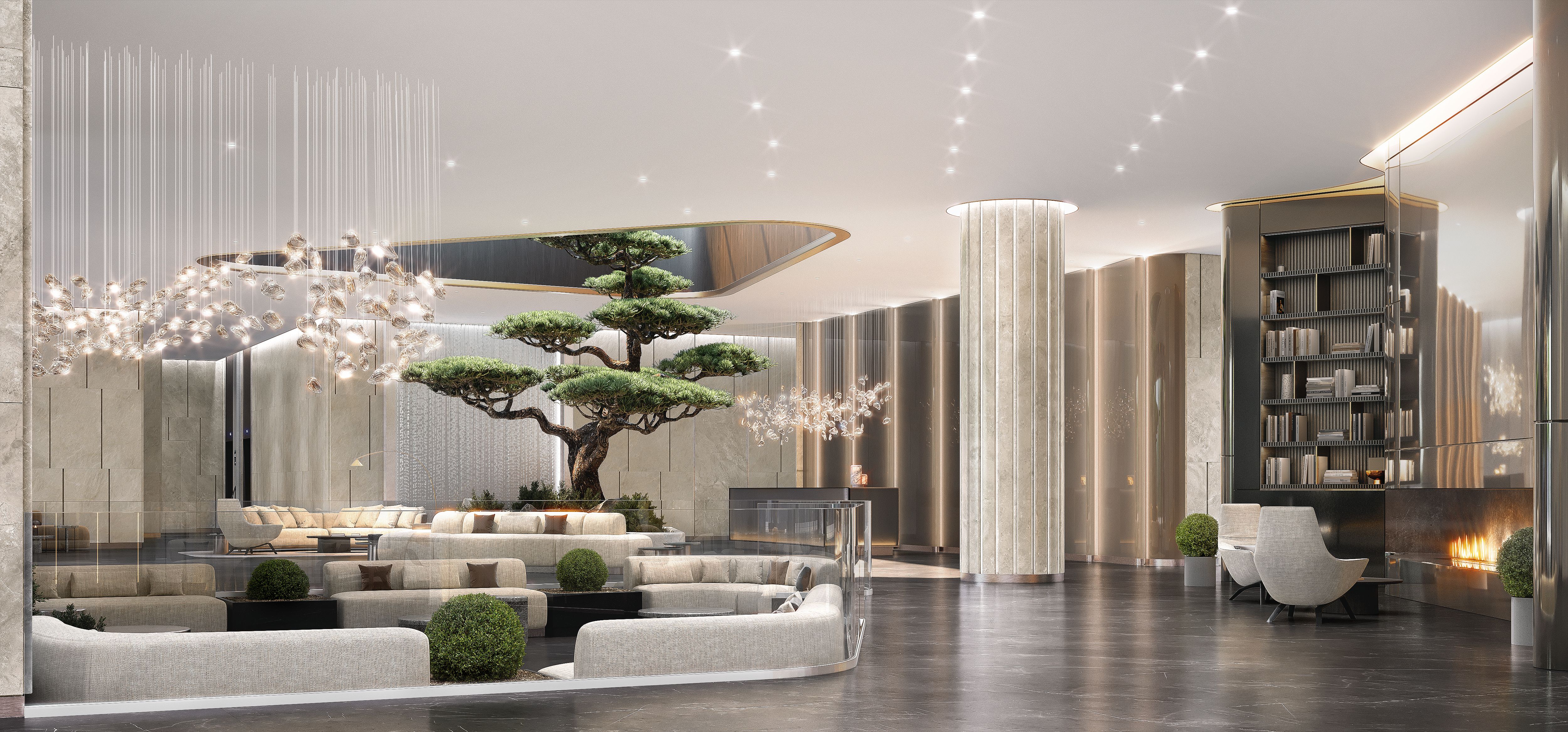 Этот дом — как фешенебельный отель. Зона дроп-офф, элегантное лобби: благородные материалы, эксклюзивные световые инсталляции, декоративное озеленение.