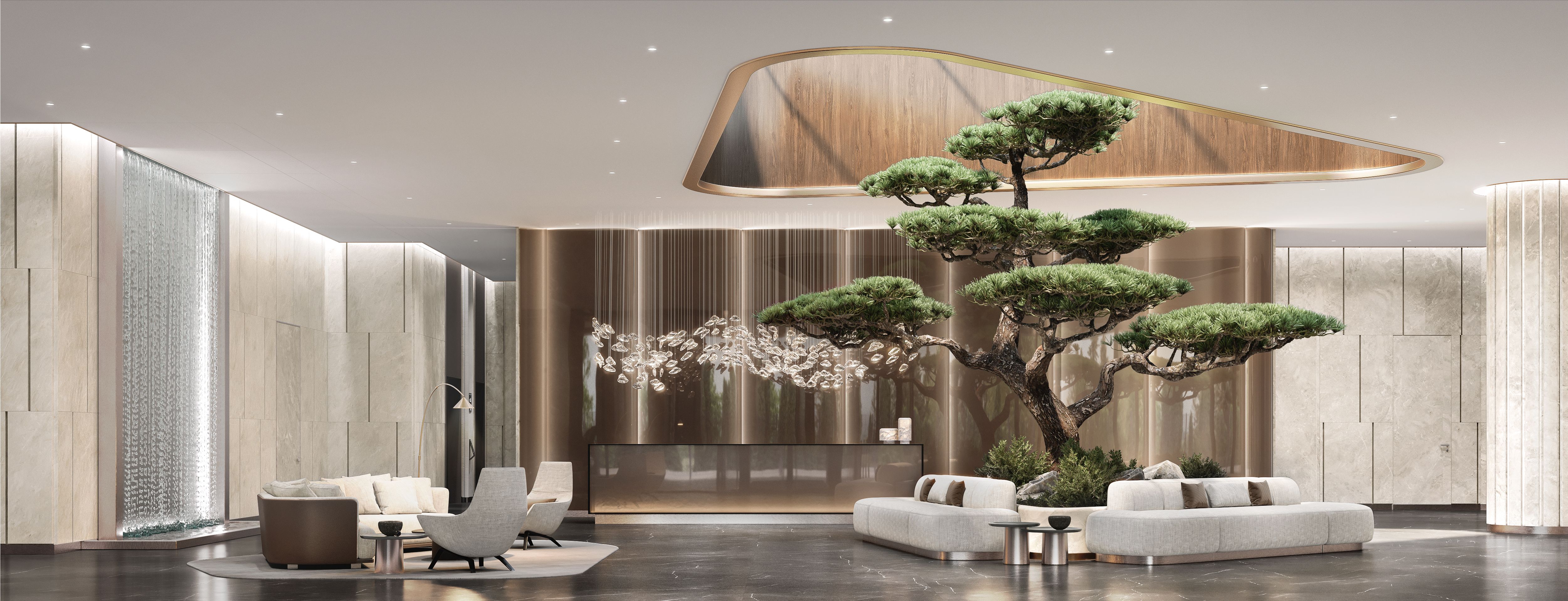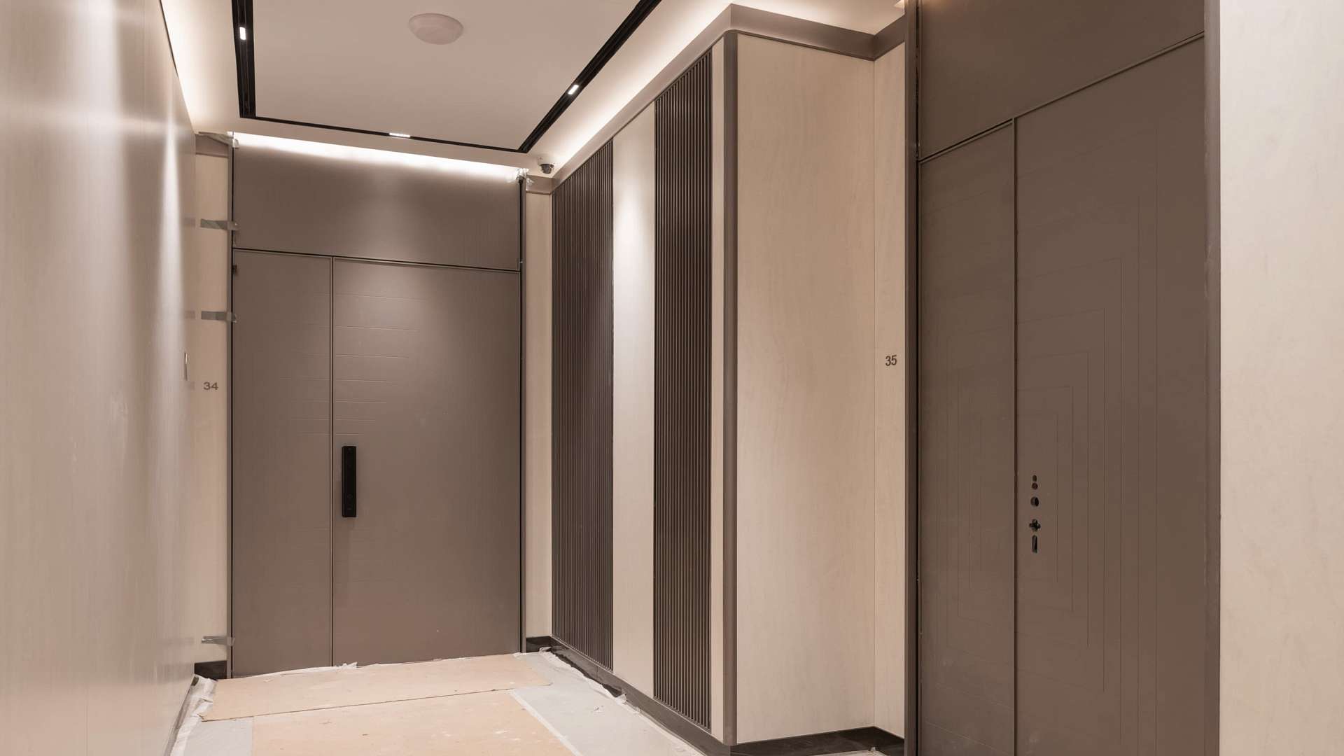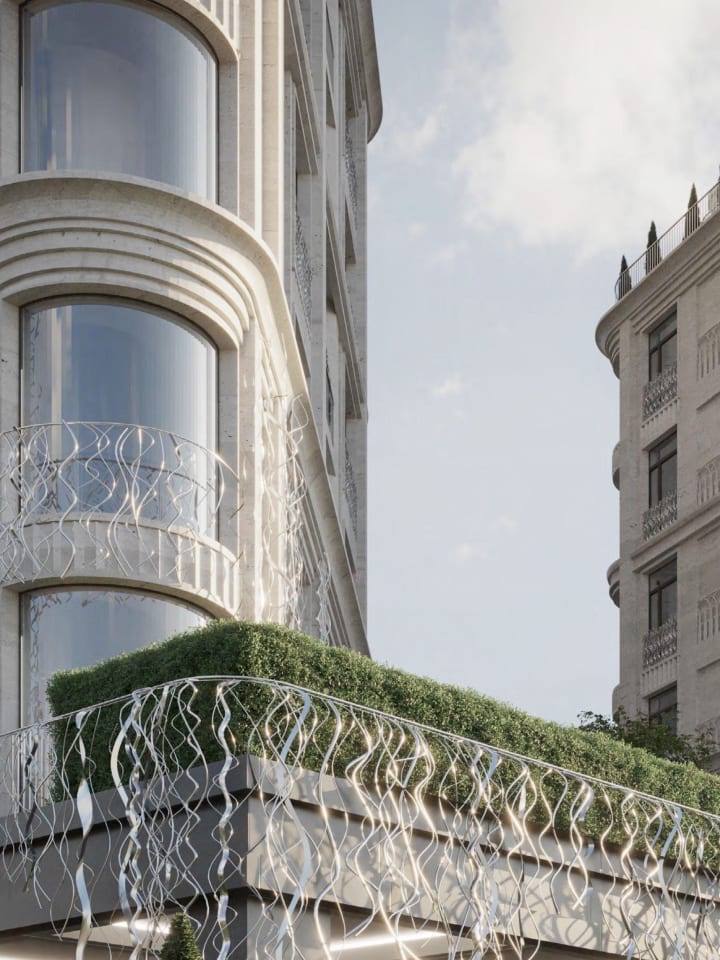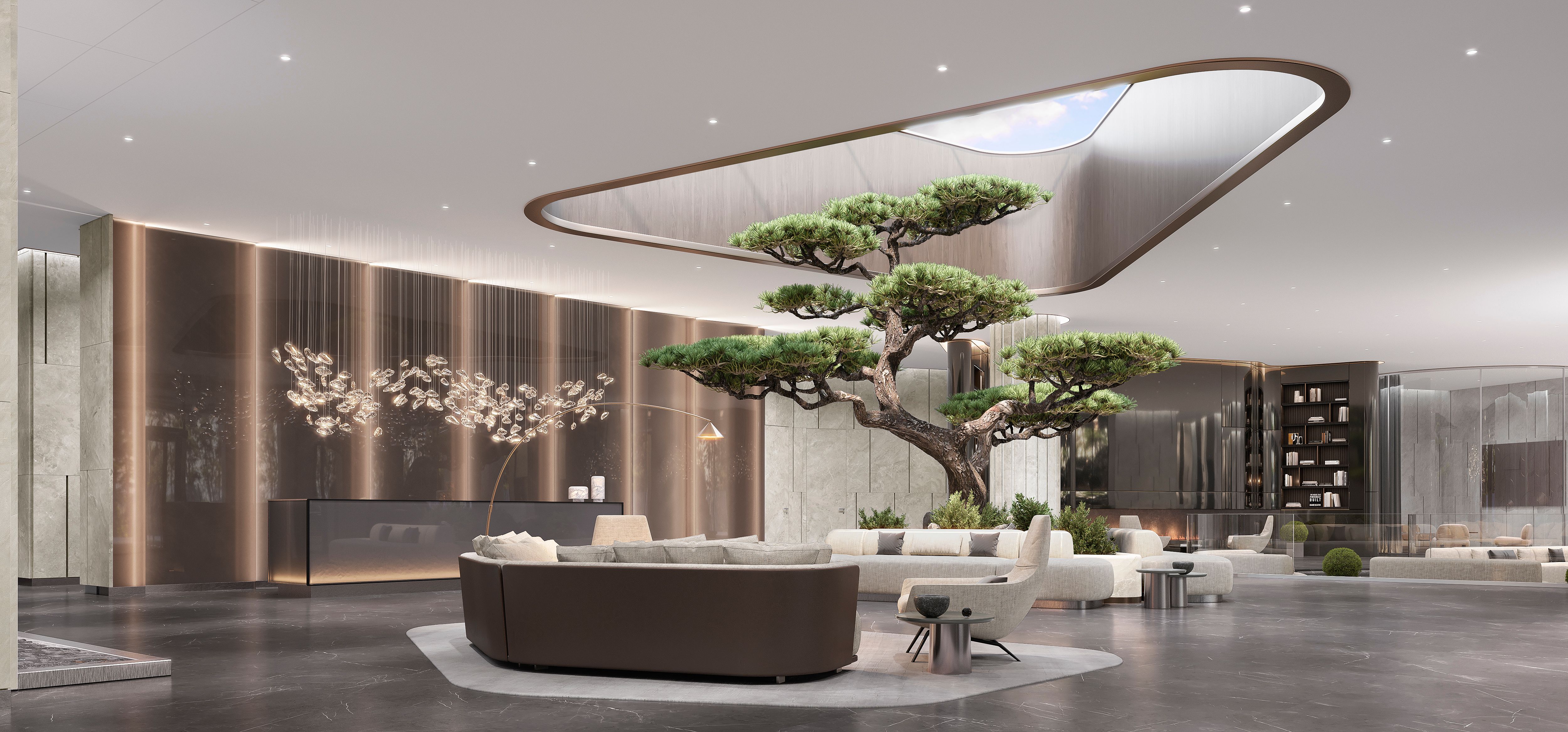 Этот дом — как фешенебельный отель. Зона дроп-офф, элегантное лобби: благородные материалы, эксклюзивные световые инсталляции, декоративное озеленение.